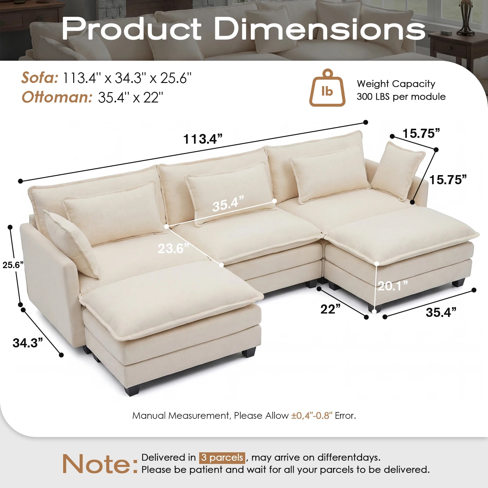 113.4" Modular Sectional Sofa with Ottoman, Couch with Deep Seat (23.6" D), Solid Wood Frame