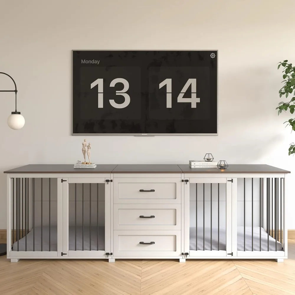 Dog Crate - Wooden Dog Kennel Furniture with 3 Drawer, Double Doors with Locks, 95x23x32H, White