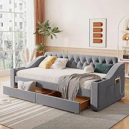 Twin Size Daybed with Upholstered Storage Armrests, USB Charging Port, and Wood Slat Support, Including 2 Drawers